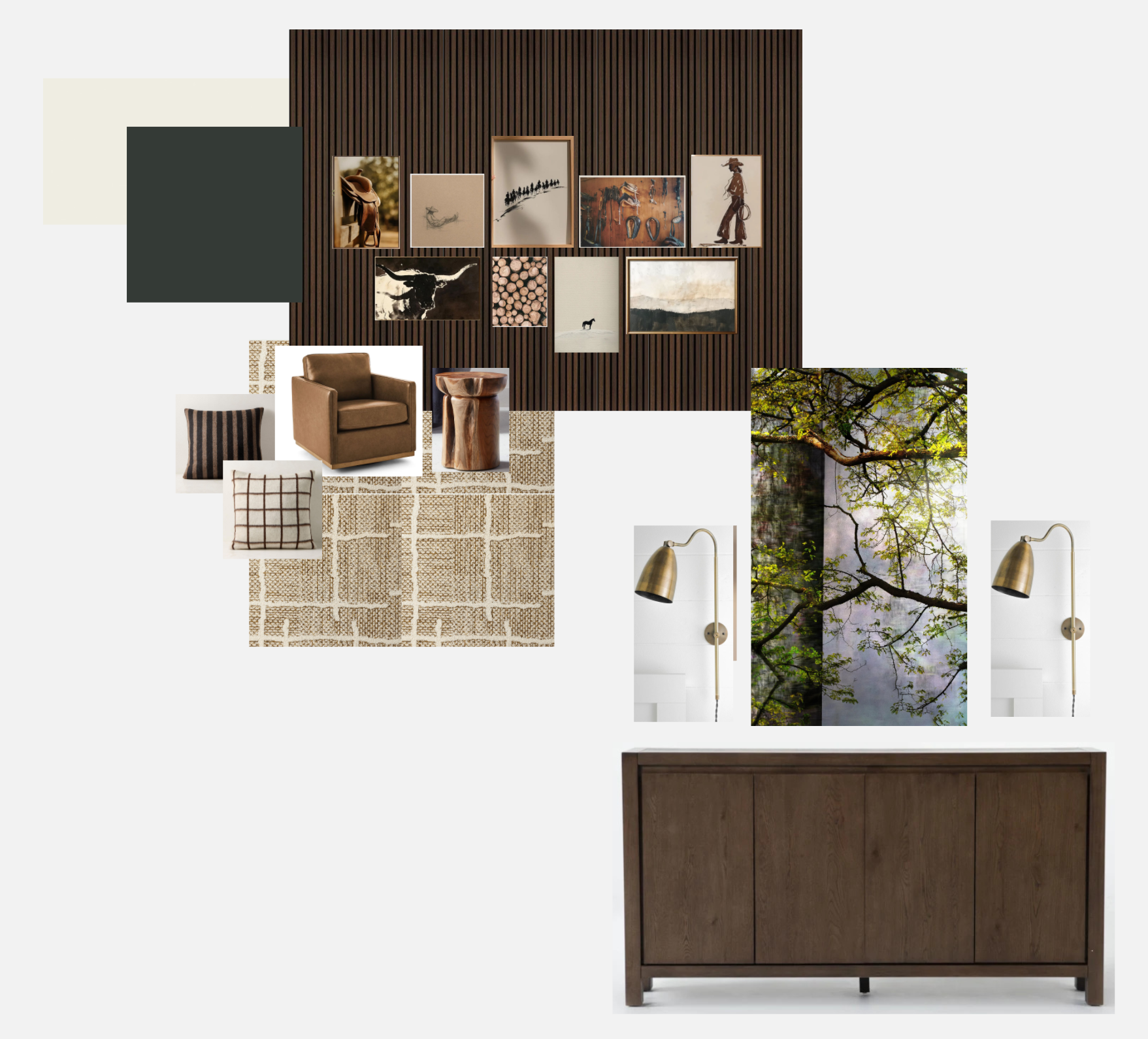 This independent project was created for the main reception area of Sunnyside Lodge. Mandy Kent’s design concept drew on the theme of “Modern Cowboy,” blending contemporary forms with elements of the regional landscape. She selected Dawn Arriving as the signature artwork for the space, intended to anchor the room and create an immediate visual focal point upon arrival.
